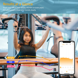 • 13 Essential Measurements - Smart Scale using BIA technology to accurately measure your physical information, including weight, BMI, body fat, metabolic age, visceral fat, muscle mass and so on. All the data will save on your phone, you can track your fitness programs and changing curve at any time. Help your know your body better.